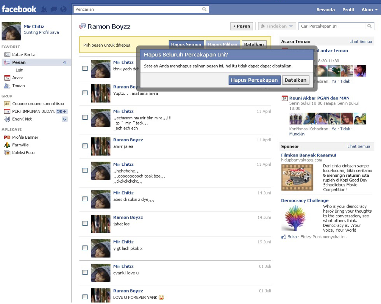 | Cara menghapus semua pesan inbox facebook Posted: 06 Sep 2011 08:18 PM PDT Buat YanG bLum Tau n KeBinGungan aja Gan. . .Plus meNuhin TOS tentunya. . . hehehe :D cekedot: Baru baru ini Facebook telah merubah setingan pada kotak pesan dimana chat digabung dengan kotak pesan. Meski terlihat lebih simpel, namun bagi yang masih baru tentu mengalami kebingungan. Misalnya saja yang saya alami adalah dalam rangka menghapus pesan masuk dan chat yang di Facebook. Mengapa? Karena sekarang chat dan pesan masuk digabung. Berikut adalah langkah-langkah cara menghapus pesan. 1.Buka kotak pesan Anda | Spoiler: